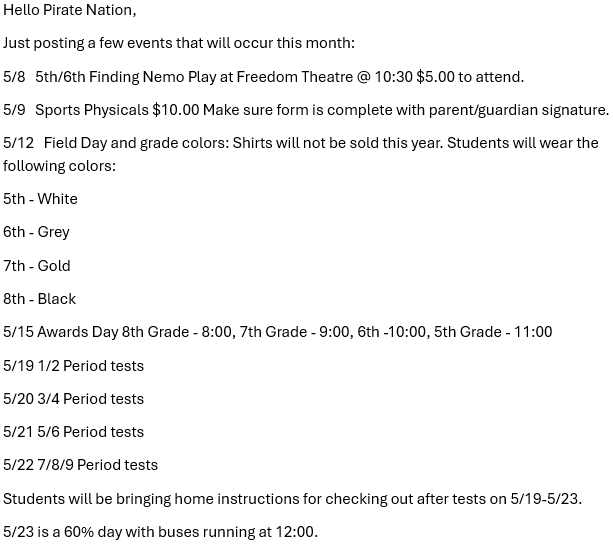 Reminder: Parents, all students will need a check-out note to check out tomorrow. Anyone who does not have a note will have to be checked out through the office. Students will be allowed to check out at 11:45 AM. Pickup will be in the normal spots for students: 5/6 from the stadium parking and 7/8 from the front of the school.